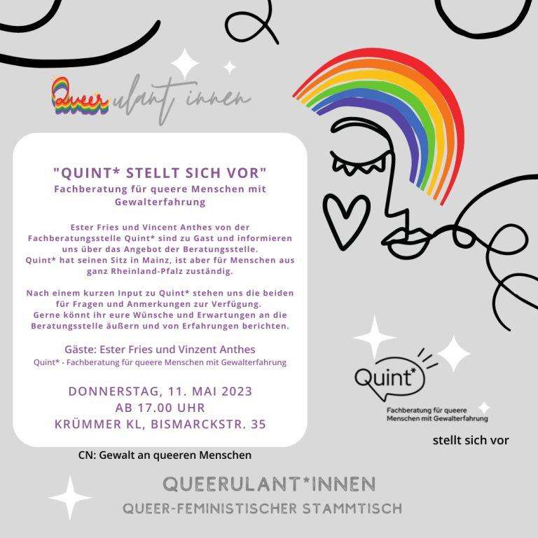 Ester Fries und Vinzent Anthes von der Fachberatungsstelle Quint* sind zu Gast und informieren uns über das Angebot der Beratungsstelle. Quint* hat seinen Sitz in Mainz, ist aber für queere Menschen und ihre Angehörigen aus ganz Rheinland-Pfalz zuständig.