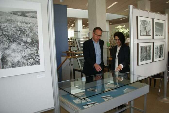 Eindringliche Motive in der Pfalzbibliothek: Fotograf Reiner Voß und Bibliotheksleiterin Claudia Germann