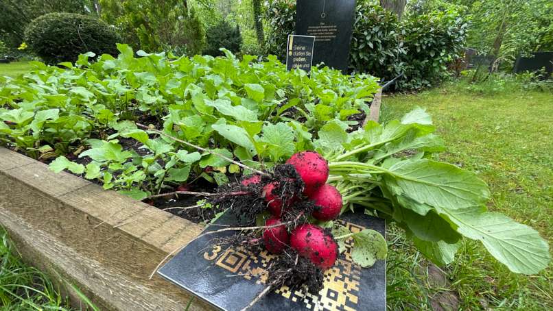 2 Sorten Salat und die Radieschen sind nun reif- alles alte Sorten der roten Liste. Mit der Motivation eines Schildes, dass diese Gemüse für alle da sind – wird fleissig geerntet ! (Viele sagten mir, es würde niemand was Essbares vom Friedhof mitnehmen – so irrt man) die 12 anderen Sorten sind gepflanzt und wachsen- Gurke und Tomaten folgen kommende Woche