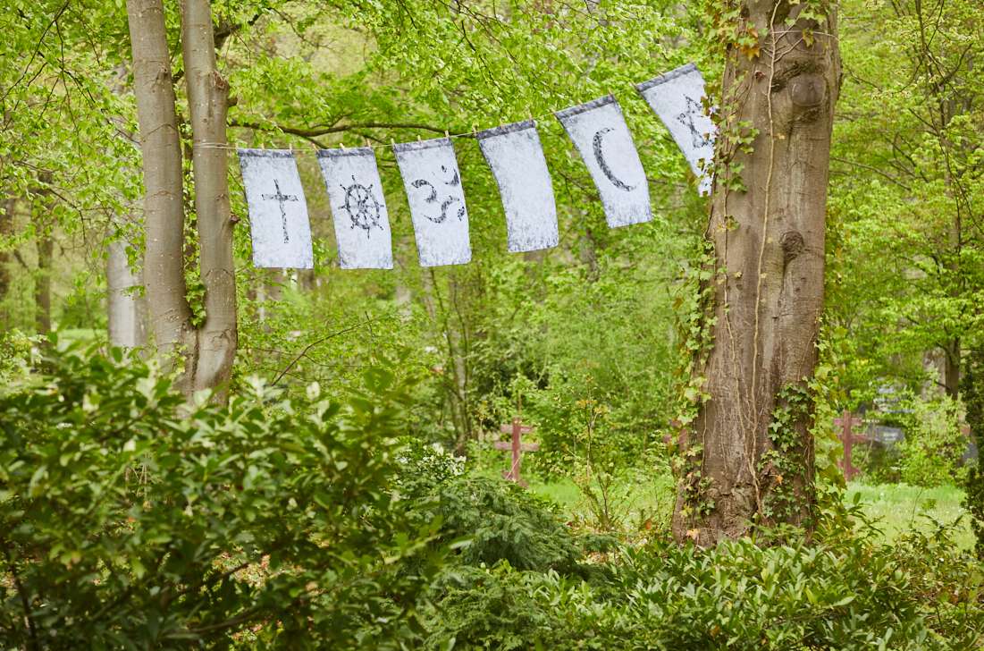 Die Symbole der 5 Weltreligionen, sowie eine „Leerfläche“ sind künstlerisch umgesetzt und schimmern jeweils aus einer Fläche von Federn heraus; diese werden mittels leichter filigraner Fahnen als Reihung an den Bäumen präsentiert. An 10 Stellen auf dem Friedhof finden sich diese Zeichen der Religionen.