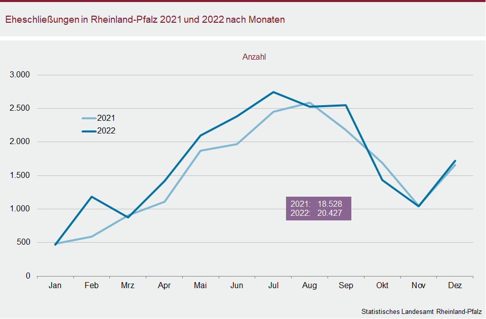 Insgesamt 20.427 Paare gingen in Rheinland-Pfalz im Jahr 2022 den Bund fürs Leben ein, das waren annähernd 1.900 mehr als im Jahr zuvor (plus 10,2 Prozent). Damit stieg nach zwei Jahren rückläufiger Trauungszahlen die Zahl der Paare, die im Standesamt den Bund der ewigen Treue schloss, wieder an. Unter den frisch Getrauten waren darunter 498 gleichgeschlechtliche Paare (2021: 410).