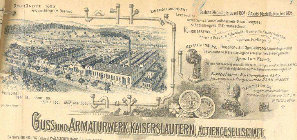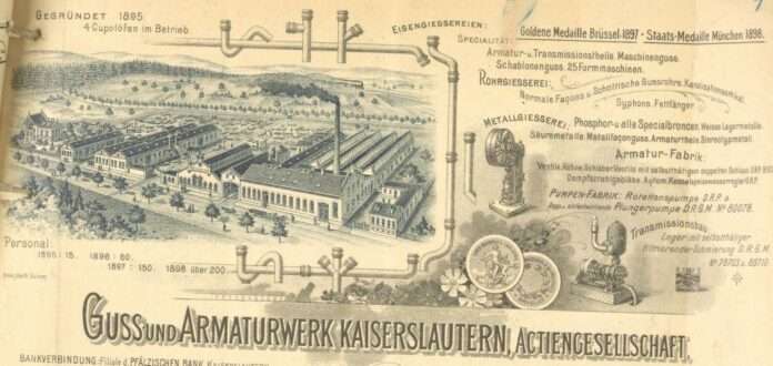 Der vielleicht schönste Hinweis auf die recht lange Gießereitradition Kaiserslauterns und der Pfalz ist sicherlich eine Gießpfanne am 1987 von Gernot Rumpf geschaffenen „Kaiserbrunnen“ am Ostende der Kaiserslauterer Steinstraße. In der Tat sind im pfälzischen Raum Eisenbergbau, Eisenerzeugung und Eisenverarbeitung in der Spätantike, im Mittelalter und in der frühen Neuzeit nicht unbekannt. Doch Industriebetriebe im heutigen Sinne, die in der Pfalz Erze verhütteten, bestehen erst seit der zweiten Hälfte des 19. Jahrhunderts. Vor allem die an pfälzischen Standorten vertretenen „Gienanth‘schen Eisenwerke“ oder ACO Guss Kaiserslautern sind noch vielen ein Begriff. Vor nunmehr 125 Jahren gegründet, ist die letztgenannte Gießerei das drittälteste der noch bestehenden Großunternehmen Kaiserslauterns.