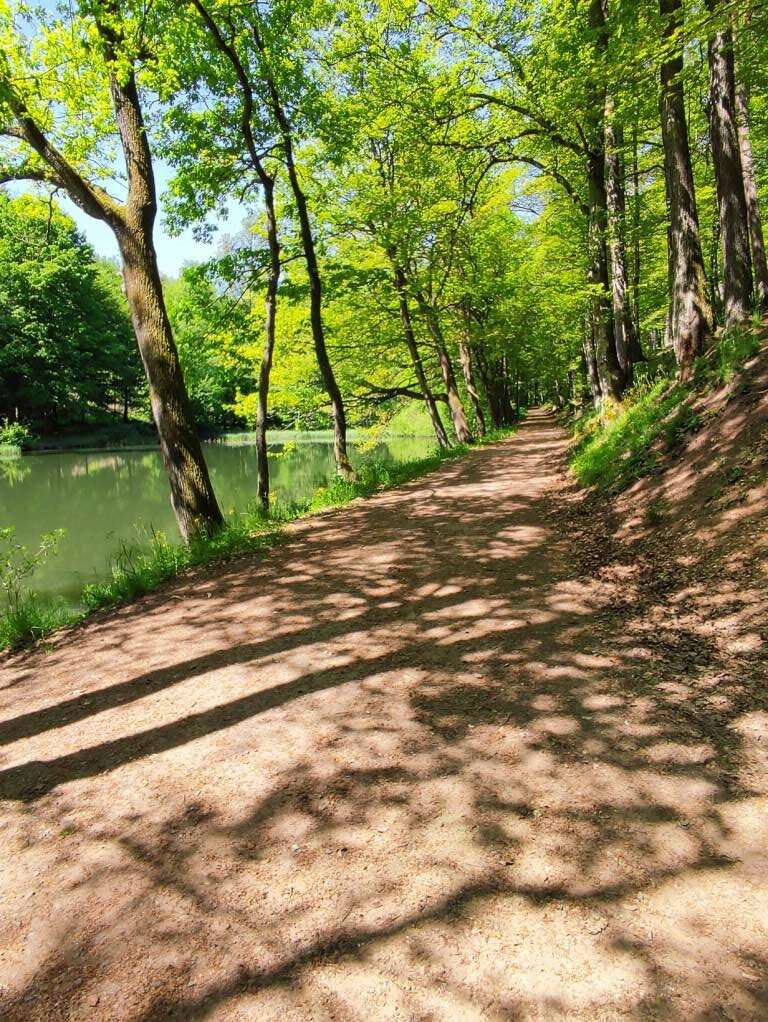 Bei sommerlichen Temperaturen führte der abwechslungsreiche Weg durch schattenspendenden Laubwald, vorbei an Teichen und saftigen Wildwiesen zum Schallbrunner Weiher mit seinem besonders gestalteten Brunnen. Ein kurzer Blick zwischendurch auf die grünen Höhen der ZAK war recht interessant.