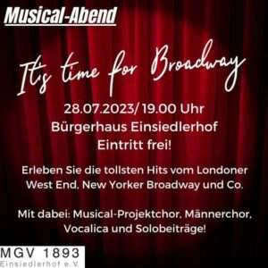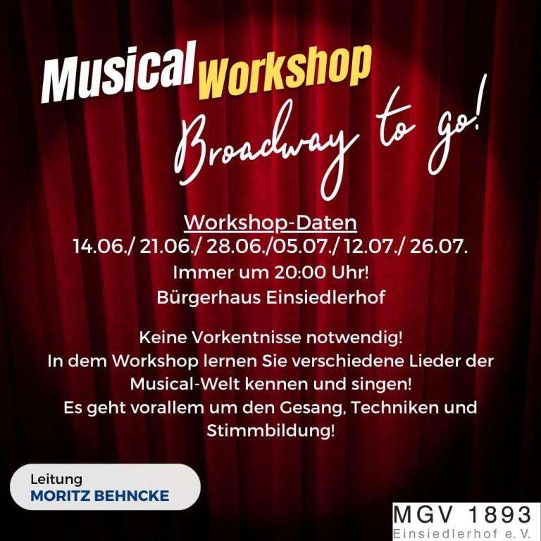 Der MGV Einsiedlerhof macht weiter in seiner Workshop-Reihe. Nachdem im Herbst 2022 bereits ein „Pfälzer Mundart“-Workshop durchgeführt wurde steht in diesem Jahr ein Musical-Workshop mit dem Titel „Broadway to go“ an.