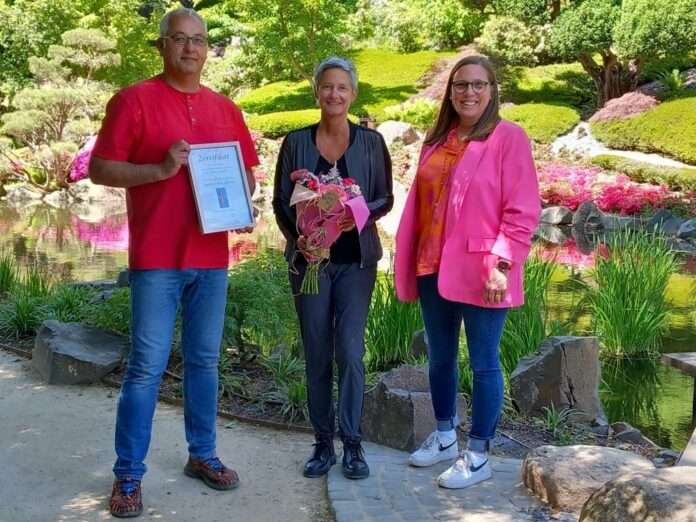 Zu einem ganz besonders freudigen Ereignis besuchte Bürgermeisterin Beate Kimmel letzte Woche den Japanischen Garten in Kaiserslautern. Auf der Zickzackbrücke im „See der schillernden Farben“ durfte sie einen Koi aussetzen, den ihr der Verein Japanischer Garten e. V. Kaiserslautern anlässlich ihrer Wahl zur Oberbürgermeisterin geschenkt hatte. „Ich freue mich sehr über diese große Ehre“, so die begeisterte Bürgermeisterin. Sie sei nicht nur eine große, auch persönliche Freude für sie, sondern auch ein Symbol dafür, wie sehr der Japanische Garten mit der Stadt und seiner Verwaltung verwachsen ist. Die designierte Oberbürgermeisterin ist nach dem Japanischen Generalkonsul Shinichi Asazuma erst die zweite Person, die diese Ehrung erhielt und einen Koi im Teich des Japanischen Gartens ihr Eigen nennen darf. Er wurde von ihr auf den Namen Yoshiaki getauft, was so viel wie Freude und Munterkeit bedeutet.