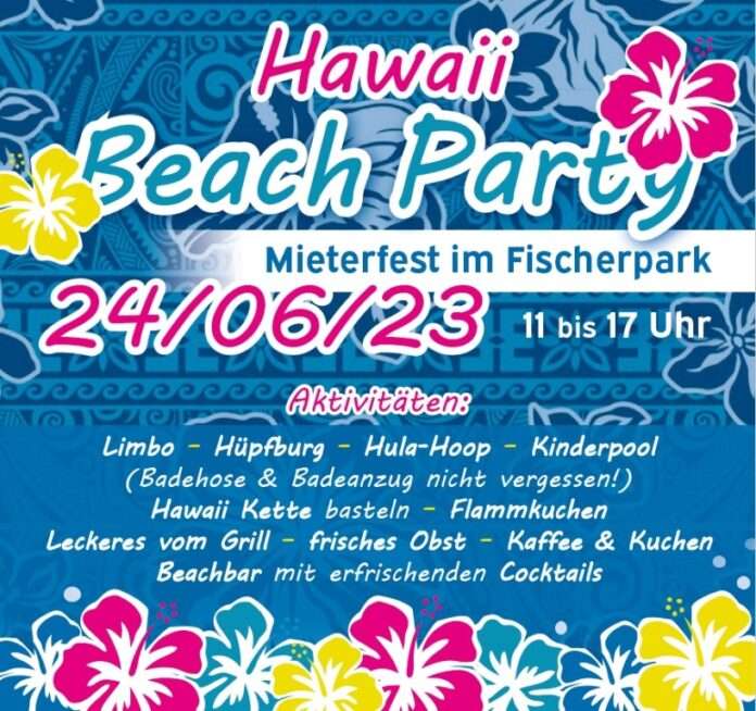 Die Bau AG Kaiserslautern veranstaltet am Samstag, 24. Juni 2023 von 11.00 Uhr bis 17.00 Uhr ein Mieterfest im Fischerpark, hinter der Geschäftsstelle der Bau AG, Fischerstraße 25, 67655 Kaiserslautern. Hierzu sind alle Mieterinnen und Mieter der Bau AG aber auch Nicht-Mieter recht herzlich eingeladen. Neben diversen Leckereien vom Grill, sowie herzhaften und süßen Flammkuchen und kühlen Getränken können sich die Besucher des Mieterfestes auf Kaffee und Kuchen der Kindertagesstätte Tausendfüßler freuen. Das Mieterfest der Bau AG steht in diesem Jahr unter dem Motto „Hawaii Beach Party“. Dazu gehört natürlich auch eine Strandbar mit erfrischenden Cocktails. Für die Kinder hat die Bau AG neben einer Hüpfburg auch Kinderpools aufgebaut (Badehose und Badeanzug nicht vergessen!). So genannte „Lei“, die klassische Hawaii-Blumenkette, können die Kinder vor Ort selbst basteln – oder sie lassen sich mit glitzernden Kinder Tattoos mit hawaiianischen Motiven verschönern.