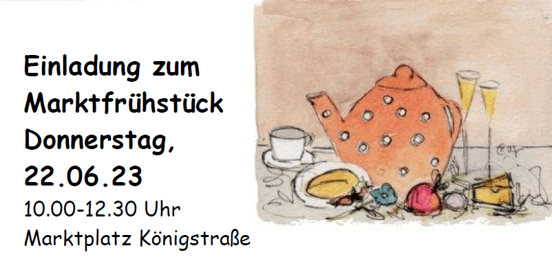 Am Donnerstag, 22.6.23 von 10 bis 13 Uhr findet das Marktfrühstück auf dem Markt in der Königstraße statt. Alle Bürgerinnen und Bürger sind herzlich eingeladen bei einer Tasse Kaffee oder einem Glas Sekt die Marktatmosphäre zu genießen und miteinander ins Gespräch zu kommen. Das Pfalzklinikum informiert über mögliche Therapieformen, herzlich digital stellt die Plattform KL MitWirkung vor und die Pflegestützpunkte stehen für Fragen zur Verfügung.