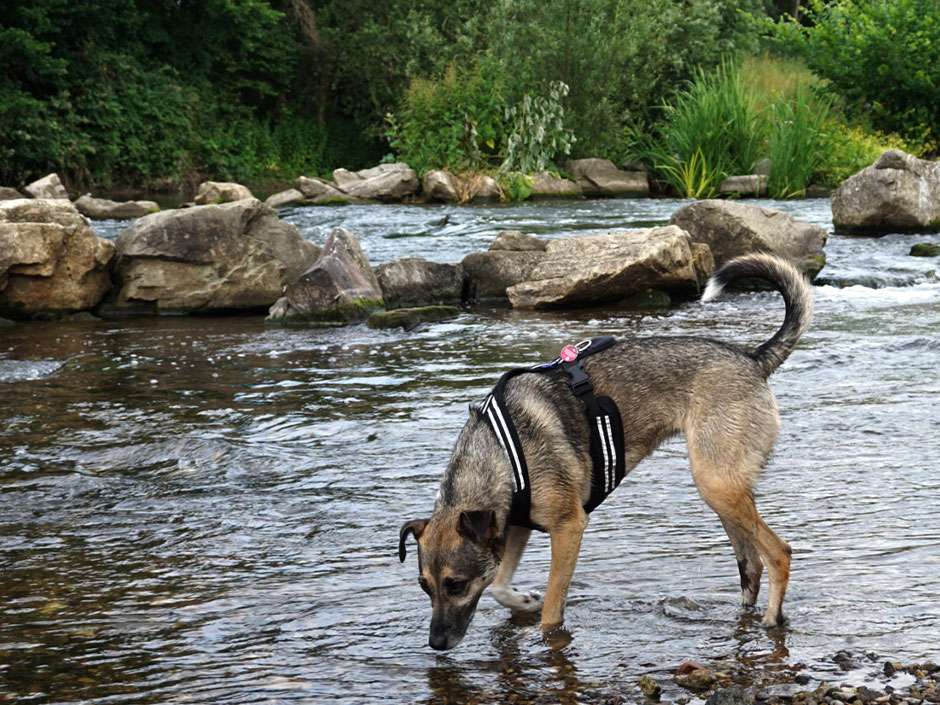 Hunden droht bei übermäßiger Belastung bei hohen Temperaturen ein Hitzschlag. Lange Spaziergänge oder Trainingseinheiten sollten daher am besten in die kühleren Morgen- und Abendstunden verlegt werden. Zudem ist es ratsam Feld- oder Waldwege zu nutzen, da asphaltierter Boden sich in der Sonne schnell aufheizt. Das kann dazu führen, dass Hunde sich die Pfotenballen verbrennen. Viele Hunde freuen sich auch über eine Abkühlung im See, Bach oder Fluss. Dabei sollten Hundehalter:innen ihren tierischen Liebling immer im Blick behalten, ihn nicht zu weit hinaus schwimmen lassen und eventuelle Strömungen beachten. Für zu Hause gilt: Schattenplätze einrichten und für frisches Wasser sorgen.