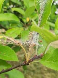Die Raupen der Gespinstmotte bauen Nester, die an ausgeprägten weißen Gespinsten erkennbar sind. Sie befallen alle Pflanzenarten, vor allem aber Ziergehölze sind davon betroffen. In den Gespinsten leben oft sehr viele Larven, die an den betroffenen Pflanzen kahle Stellen fressen. Diese erholen sich allerdings recht zügig davon, so dass es sich um keine anhaltende Schädigung handelt. Nach der Verpuppung der Raupen lösen sich die Gespinste durch Niederschläge und Wind wieder auf. Von der Gespinstmotte befallene Pflanzenteile können bedenkenlos weggeschnitten und die Raupen aufgesammelt werden, da sie für Menschen und Tiere ungefährlich sind.