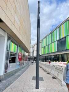 Ein weiterer wichtiger Meilenstein war die Installation der 60 neuen Listmasten sowie der 28 Bodenstrahler entlang der Fruchthalle und des 23er-Denkmals. Wie der für die Straßenbeleuchtung zuständige Abteilungsleiter Arno Schönau erklärt, hatte man sich vorab konkrete Gedanken über die Auswahl der künftigen Beleuchtungselemente gemacht. „Die Neue Stadtmitte sollte modern und attraktiv ausgeleuchtet werden, dabei aber keine Lichtverschmutzung erzeugen, also möglichst wenig Licht nach oben abstrahlen. Hier halten wir uns an die Vorgaben der seit 2021 geltenden Beleuchtungsrichtlinie.“ An den Lichtmasten sind neben der Beleuchtung teilweise auch WLAN-Router sowie Kameras zur Erfassung der Buslinien-Nummern installiert. Personen werden von den Kameras nicht erfasst.