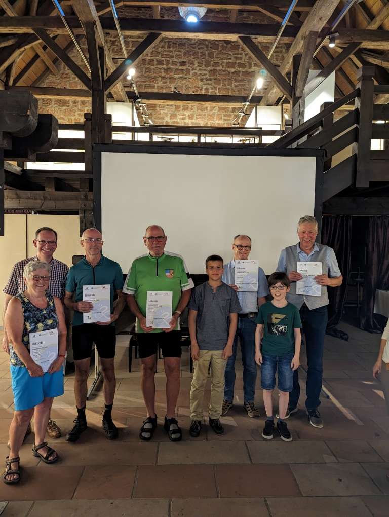 Bei der Urkundenübergabe wurden wieder die erfolgreichsten Einzelradlerinnen (1. Platz: Margot Merz für 1.109 Radkilometer) und Einzelradler (1. Platz: Armin Obenauer für 3.111 Radkilometer) sowie die erfolgreichsten Teams (1. Platz: Albert-Schweitzer-Gymnasium für insgesamt 32.6047 Radkilometer) ausgezeichnet. Für 15 Jahre Teilnahme und Schirmherrschaft und ungezählten Tonnen eingespartem CO2 überreichten die beiden städtischen Organisatoren der Veranstaltung, Julia Bingeser und Christian Ruhland, dem Beigeordneten ebenfalls eine Urkunde in Gold. Die Auslosung der vielen schönen Sachpreise, die durch die Sponsoren bereitgestellt wurden, sorgte noch einmal für Spaß und gute Stimmung.