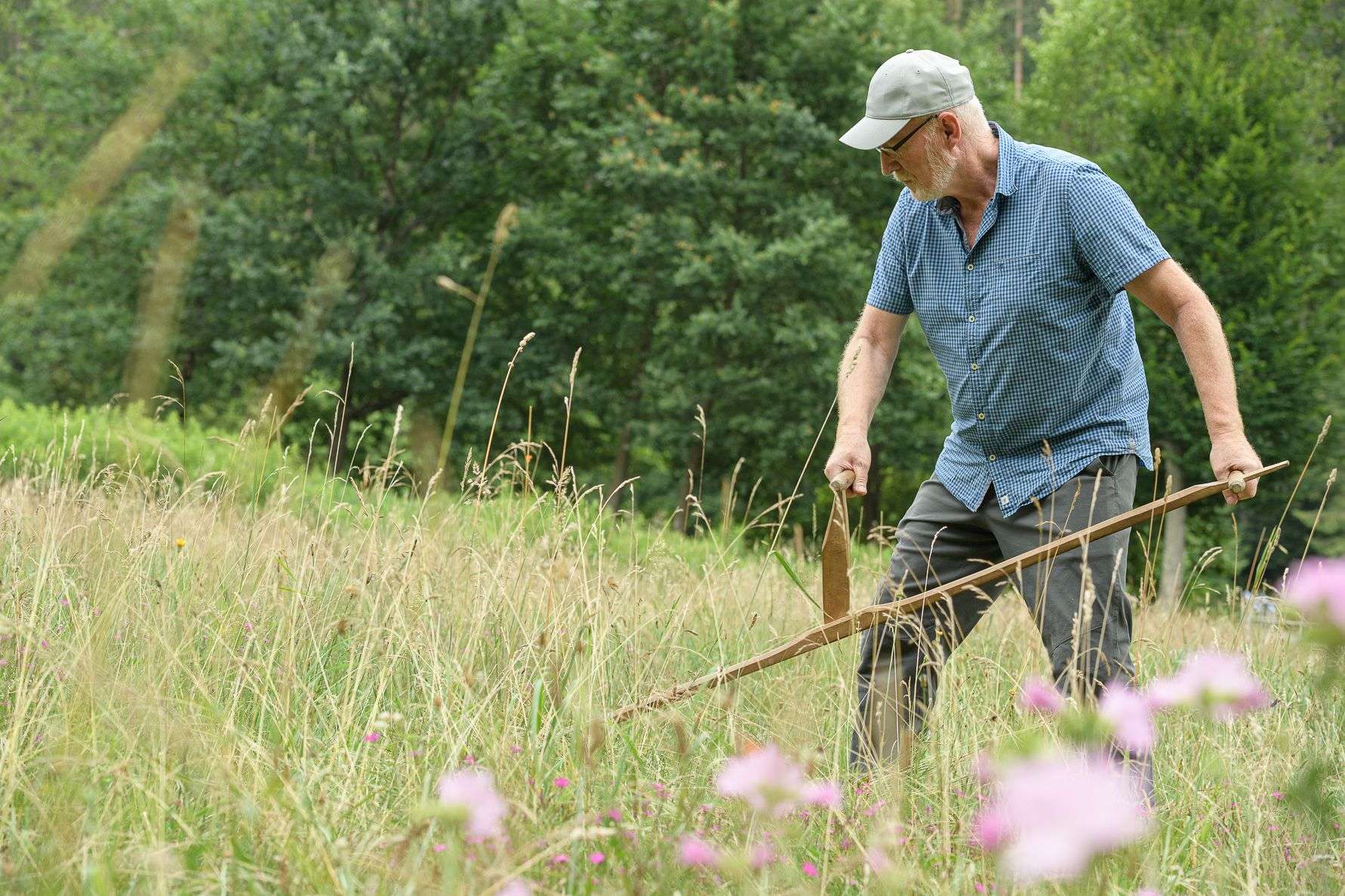 BU: Richtig umgehen mit der Sense: In einem Mäh- und Dengelkurs wird gezeigt, wie es geht