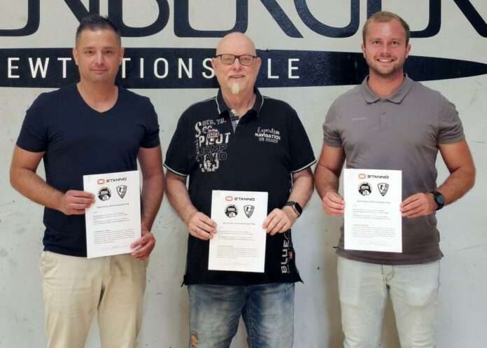 Der TuS 04 Kaiserslautern-Dansenberg wird in den kommenden fünf Jahren mit dem niederländischen Sportartikelhersteller Stanno zusammenarbeiten. Darauf haben sich TuS-Vorstandsmitglied Alexander Schmitt und Key Account Manager der Marke Stanno Maximilian Krüger in sehr angenehmer Verhandlungsatmosphäre verständigt. Mit an Bord ist außerdem Klaus Sperl, der mit seinem in Lampertheim ansässigen Unternehmen, Teamsport Sperl, als regionale Kontaktstelle fungiert.