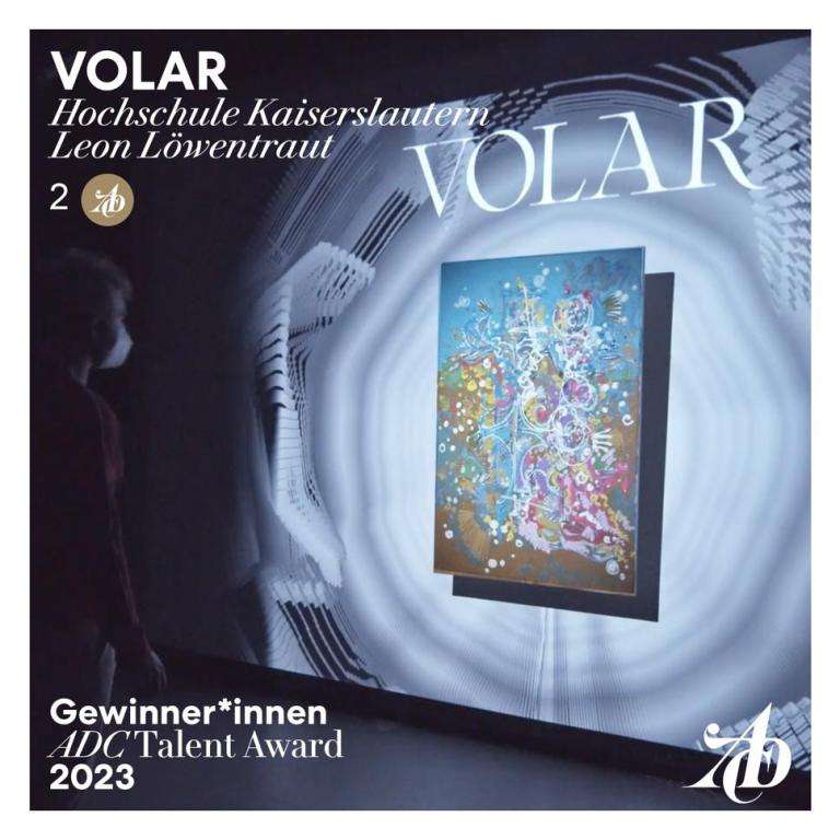 Beim Doppel-Gold für „Volar“ geht es um die Frage: Wie sieht die Kunstausstellung der Zukunft aus? Dieser Frage widmeten sich die Studierenden der Masterclass Virtual Design in Kooperation mit dem bekannten jungen Maler Leon Löwentraut. Dieser hatte an der Hochschule Kaiserslautern einen Lehrauftrag zum Thema: „Future Exhibition Design“. Daraus entwickelt hat sich das Projekt „VOLAR“ – eine zukunftsweisende Installation, die eine neue Kunst-Rezeption ermöglicht. Dazu gibt es ein topografisches Model eines Löwentraut-Gemäldes zum Ertasten, dessen Daten Grundlage für eine immersive Raumprojektion bieten. Die Jury war beeindruckt von der Vielschichtigkeit der Möglichkeiten, Kunst zu erleben. Konzipiert wurde die Arbeit von den Talenten: Alina Braun, Junjie Liu, Michel Lörz, Melissa Schramm, Lukas Speyer. Betreut wurden sie von den Dozenten Leon Löwentraut, Matthias Pfaff, Chris Schmachtenberg.
