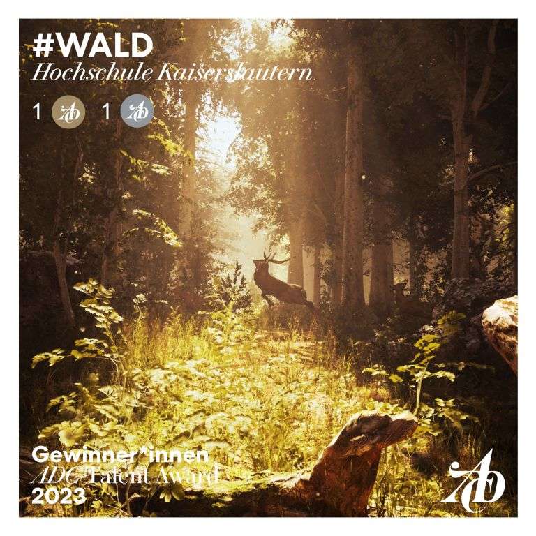 Eine große Gruppe ( Marcel Adam, Madlen Barth, Florian Bennert, Lena Cellen, Romina Kroll, Michel Lörz, Till Rheinländer, Lisa-Marie Rödler, Lukas Speyer, Lexa Streich, Björn Vollmer) unter Anleitung der Dozenten Sara Brück, Prof. Dipl.-Ing. (FH) Matthias Pfaff und Prof. Dipl.-Des. (FH) Christian Schmachtenberg erhielt Gold für #Wald – Zeitreise durch den Pfälzerwald. Aufgabe war es, eine multimediale Inszenierung zu entwickeln, die die Geheimnisse des Pfälzerwaldes hautnah erlebbar macht. Die Lösung: #Wald ist eine hybride Multi-User Virtual Reality Experience. Diese verwandelt das Stadtmuseum in Kaiserslautern (dort lief die Ausstellung) in eine dreidimensionale Waldzeitreise. Der 3D gescannte Saal löst sich virtuell auf und nimmt die Besucher mit auf eine faszinierende Reise durch den Pfälzer Wald. Und dafür gab es dickes Lob von der Jury: Diese VR-Experience setze neue Maßstäbe, nicht nur im Talent-Bereich, sondern auch im Verhältnis zu professionellen Agenturen.