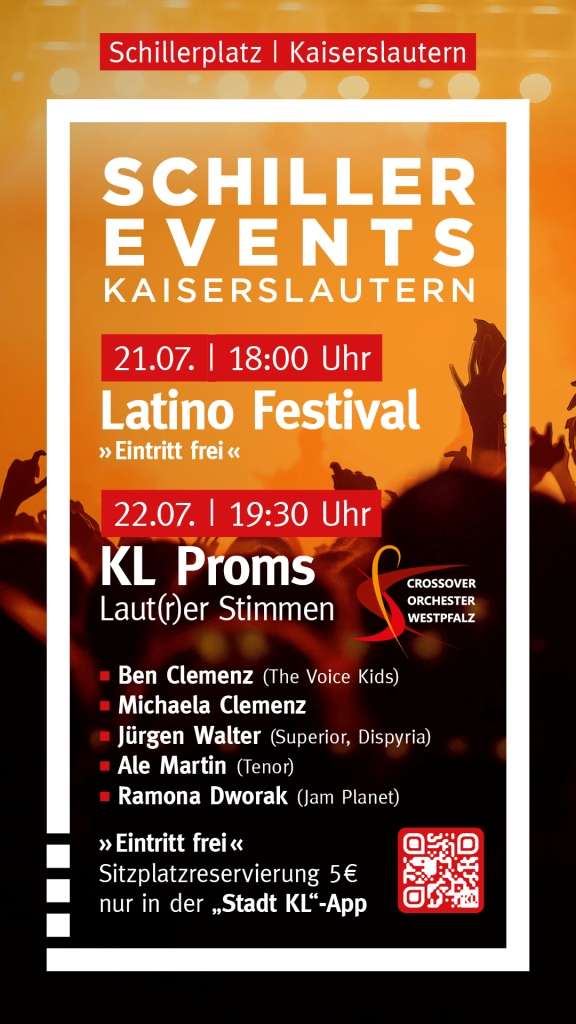 Einen Tag später, am 22. Juli, wartet dann ab 19.30 Uhr mit den „KL Proms“ ein Konzertformat mit Orchester, Band, Chor und Solo-Sängern aus der Region Kaiserslautern auf Musikfreunde, wofür der Schillerplatz mit 450 Plätzen bestuhlt wird. Unter der musikalischen Leitung von Frank Zeihsel und Jochen Messer hat das „Crossover Orchester Westpfalz“ ein vielseitiges Programm mit verschiedenen musikalischen Highlights zusammengestellt. Titel von John Miles, Tina Turner, Robbie Williams, Bon Jovi oder Marc Ronson sind nur einige des abwechslungsreichen Repertoires.