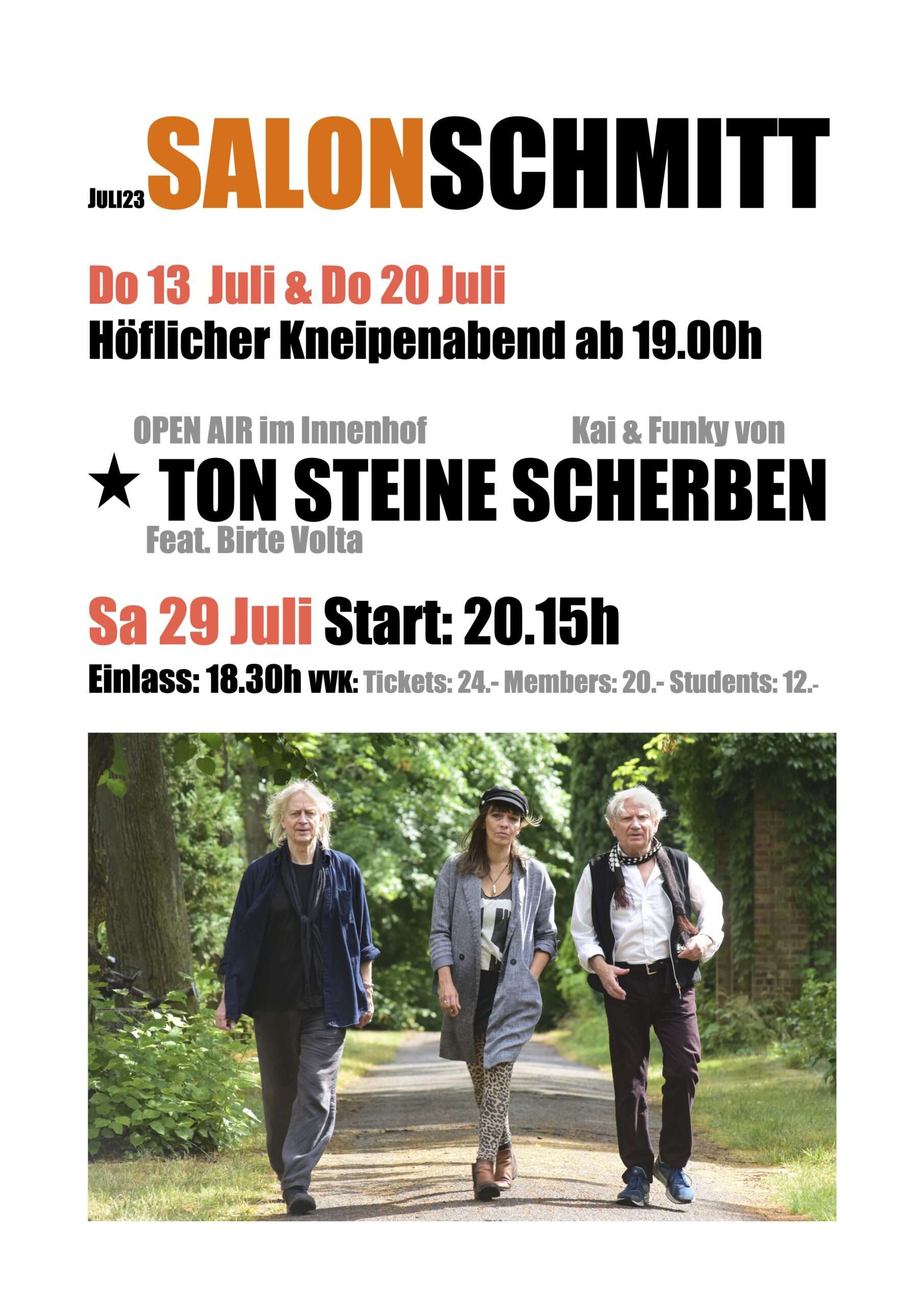 Gibt es eine deutsche Rock-Band, von der die meisten Songs auch nach über 50 Jahren kaum etwas an Aktualität verloren haben? Wahrscheinlich nicht viele, aber mit Sicherheit eine: Ton Steine Scherben. Nach dem frühen Tod ihres Sängers Rio Reiser (†1996) stand die Band im neuen Jahrtausend in verschiedenen Formationen wieder auf der Bühne. Zwei Ur-Scherben touren noch bis heute durch deutschsprachige Länder: Gründungsmitglied Kai Sichtermann (Bass, seit 1970) und Drummer Funky K. Götzner (ab 1974, jetzt Cajón). Ab April 2023 spielen sie zusammen mit der Singer/Songwriterin- Nomadin Birte Volta (Gesang, Gitarre). Birte verinnerlicht sowohl den Folk- Blues als auch den daraus entstanden Rock’n’Roll mit Leidenschaft und Poesie und greift auf langjährige Strassen- und Bühnenerfahrung im In- und Ausland zurück, mit ihrem Solo-Projekt sowie als Sängerin und Gitarristin in diversen Formationen dieser Genres. Das Trio schöpft aus dem Repertoire Rio Reisers und der Scherben und hält die Erinnerungen an eine rebellische Zeit wach: Die Radikalität der Scherben, die eine gelebte Alltags-Radikalität war.