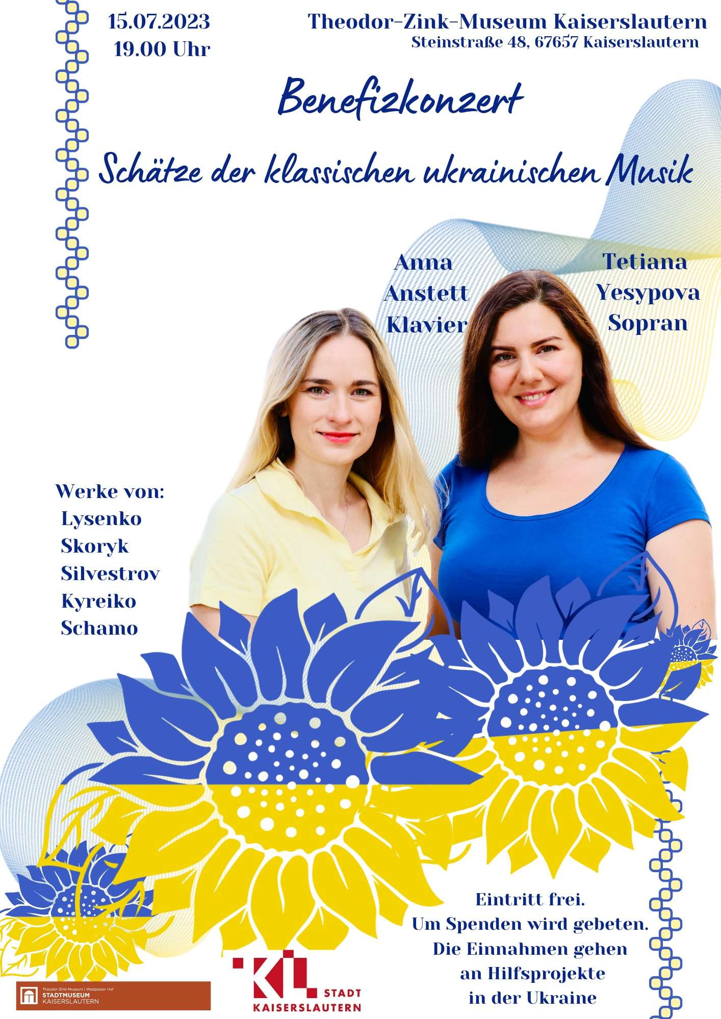 Für das breite Publikum sind Namen der Komponisten wie Mykola Lysenko, Borys Ljatoschynsky oder Myroslav Skoryk eher unbekannt, was aber nicht heißt, dass ihre Musik nicht hörenswert wäre. Nachdem ukrainische Musik lange Zeit im Schatten blieb und ihr Weg auf die großen Bühnen der Welt eher steinig war, gewinnt sie jetzt immer mehr an Anerkennung und Popularität. Die beiden Musikerinnen möchten nun auch ihren Beitrag dazu leisten und präsentieren ein abwechslungsreiches Programm mit Liedern, Arien sowie Klaviermusik von diversen ukrainischen Komponisten aus mehreren Jahrhunderten. Beginn ist 19.00 Uhr, der Eintritt ist frei, die gesammelten Spenden gehen an die gemeinnützige Organisation „Children of heroes“ (childrenheroes.org).