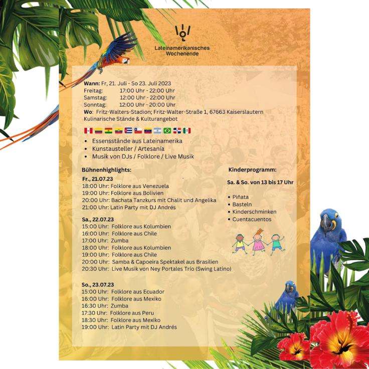Die diesjährige Sommerausgabe des Lateinamerikanischen Wochenendes in Kaiserslautern findet vom 21.07 bis 23.07.2023 im Fritz-Walter-Stadion statt. Der schön gelegene zentrale Platz, ist eine wunderbare Location um neue Kulturen kennen zu lernen, ins Gespräch zu kommen und bei schöner Atmosphäre Essen und leckere Drinks zu genießen. Träger der Veranstaltung ist die O&M Event Gastro GmbH aus Frankfurt, welche das Fest in vielen deutschen Städten organisiert. Mit der Veranstaltung bemüht sich die Eventagentur die Kultur, Gastronomie und Geschichte Lateinamerikas den Besuchern näher zu bringen.
