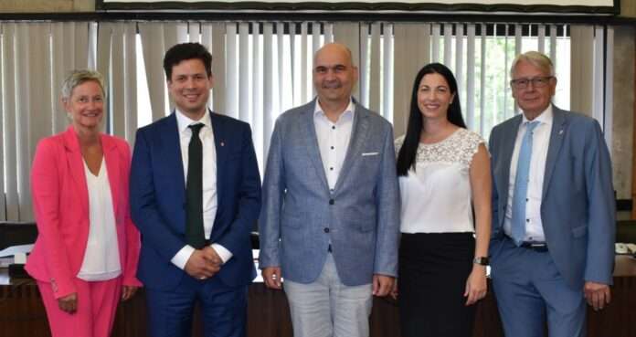 In der Sitzung des Stadtrats am 17. Juli hat Oberbürgermeister Klaus Weichel gleich zwei neue Mitglieder des Stadtvorstands vereidigt. Manfred Schulz wurde zum Bürgermeister ernannt, Manuel Steinbrenner zum neuen Beigeordneten im Dezernat IV. Für Steinbrenner markierte die Vereidigung zugleich seinen Dienstantritt, er nahm sofort nach seiner Vereidigung im Ratssaal den ehemaligen Platz von Peter Kiefer ein. Manfred Schulz wird seinen Dienst als Bürgermeister zum 1. September antreten, genau wie seine Vorgängerin und neue Oberbürgermeisterin Beate Kimmel.