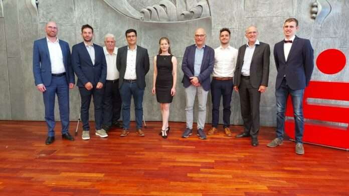 Foto (v.li.): Hartmut Rohden (stellv. Vorstandsvorsitzender Sparkasse Kaiserslautern), Nikolas Longen, Dr. Walter Altherr (Kreisbeigeordneter), Jonas Engel, Marisa Jakobs, Professor Dr. Werner Thiel, Yannik Gabelmann, RPTU-Co-Präsident Professor Dr. Arnd Poetzsch-Heffter, Marco Hoffmann. Es fehlen auf dem Bild Tania Jacob, die sich in Australien aufhält und Felix Sonneberg, der sich per Videobotschaft meldete.