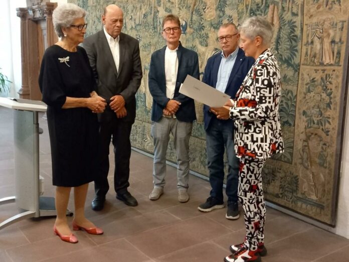 Foto (v. l.): Die Gründungsmitglieder, Vereinsvorsitzende Karin Kolb, Dieter Burghaus, Guido Höffner und Axel Ulmer bei der Verleihung durch Bürgermeisterin Beate Kimmel.