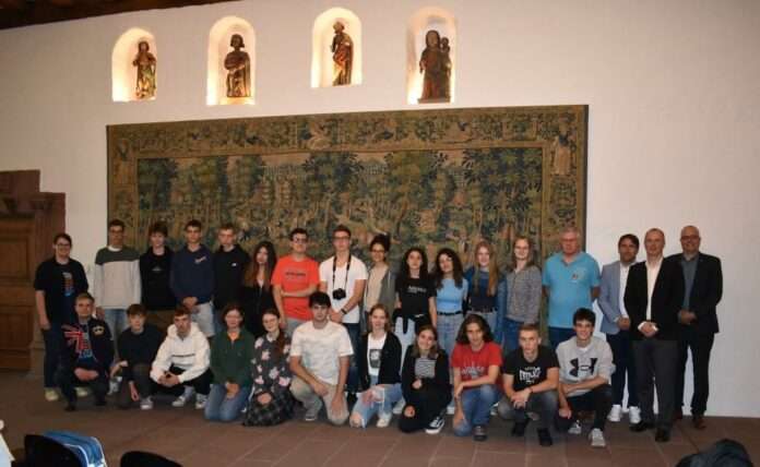 BU: Die Gruppe der Camp-Teilnehmer im Pfalzgrafensaal gemeinsam mit Gerhard Prottung sowie Volksbund-Landesgeschäftsführer Carsten Baus, dem Regionalgeschäftsführer Rheinhessen-Pfalz Ulrich Johann und dem Beauftragten für Kaiserslautern Hans-Jörg Schweitzer. Schweitzer erhielt für sein Engagement das Silberne Ehrenkreuz des Volksbundes verliehen