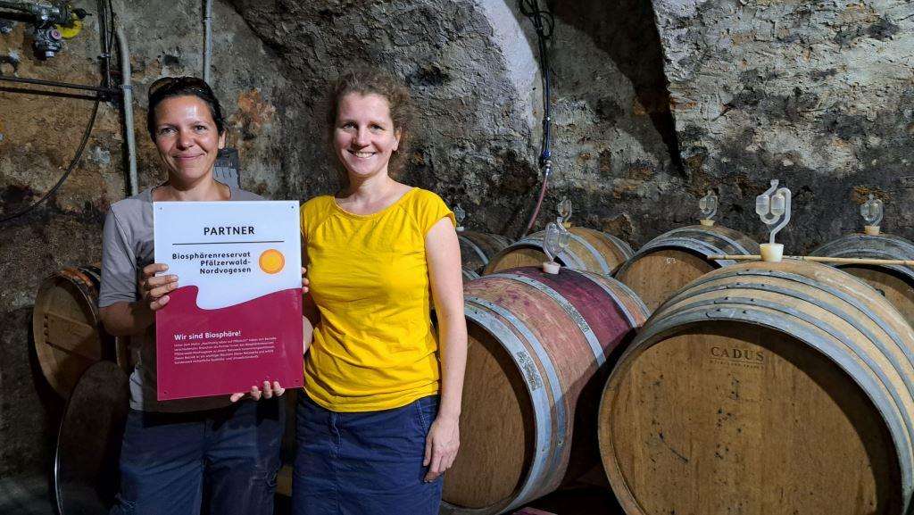 Übergabe des Partnerschilds beim Weingut Collective Z: Winzerin Marie Adler und Biosphärenreservats-Direktorin Dr. Friedericke Weber (Foto: Biosphärenreservat/frei)