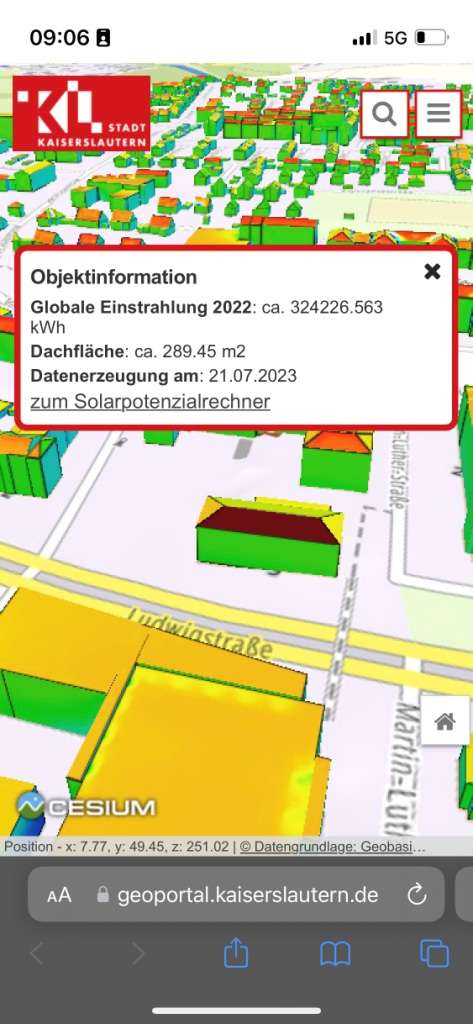 Das Kataster wurde vom Referat Stadtentwicklung, Stabsstelle Graphische Datenverarbeitung, erarbeitet und steht unter https://geoportal.kaiserslautern.de/solarkostenfrei zur Verfügung. Es wurde in einem responsiven Design erstellt und kann somit auch auf mobilen Endgeräten genutzt werden.