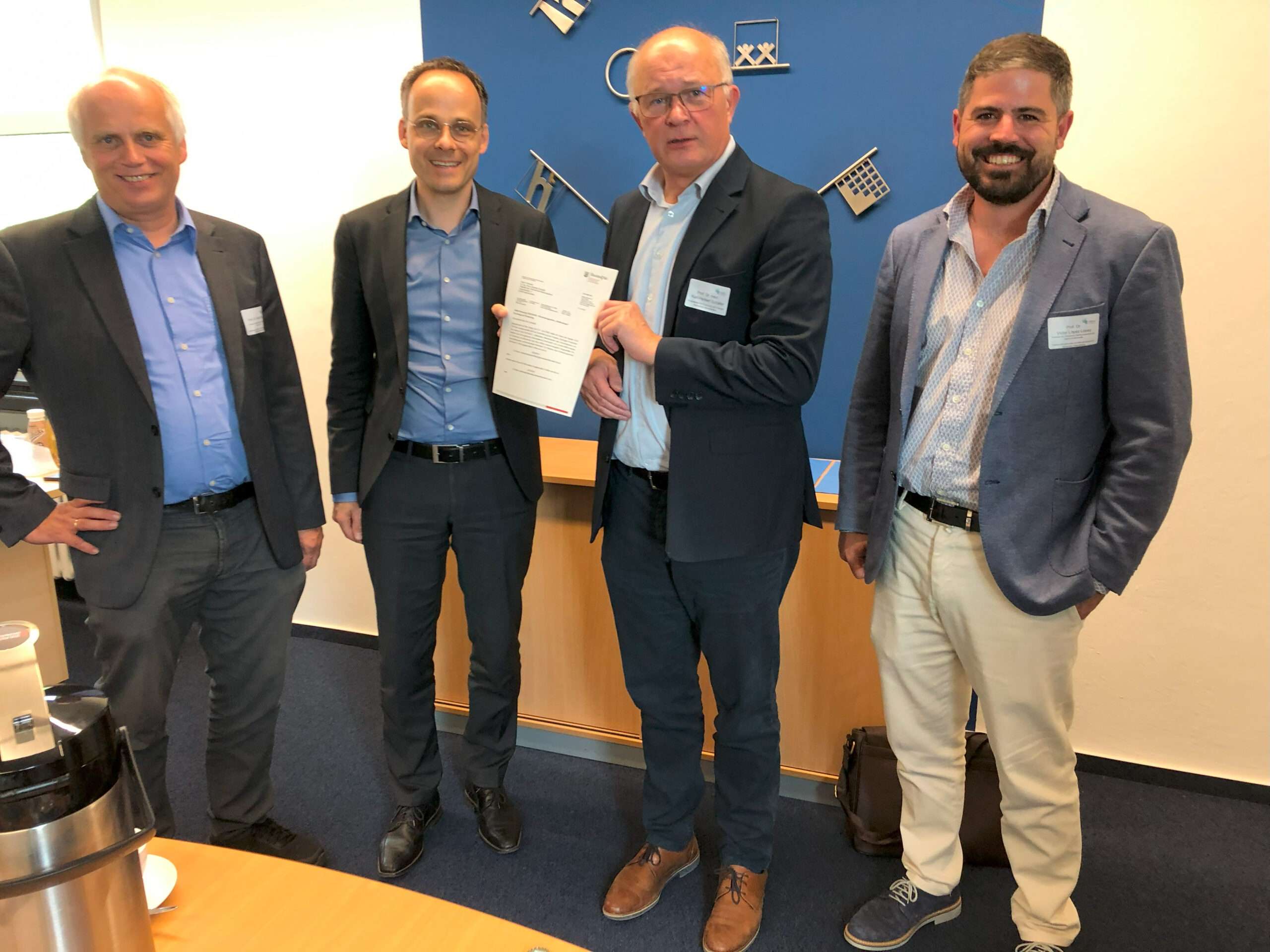 BU: Gute Laune bei der Übergabe des Förderbescheids: Prof. Dr. rer. nat. Bernd Bufe (Fachbereich Informatik und Mikrosystemtechnik), Dr. Denis Alt (Staatssekretär im Ministerium für Wissenschaft und Gesundheit), Prof. Dr. med. Karl-Herbert Schäfer (Vizepräsident für Forschung und Transfer), Prof. Dr.-Ing. Victor López López (Fachbereich Angewandte Ingenieurwissenschaften)