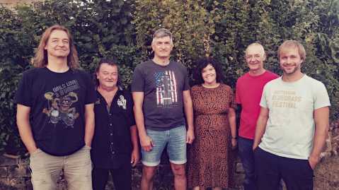 von links nach rechts: Marc Kambach (Drums, Gesang), Michael Schwartz/Blacky (Bass, Gesang), Mike Carter (Gitarre, Gesang), Karina Helfrich (Gesang), Philip Freyer (Geige) undMax Paul (Klavier)