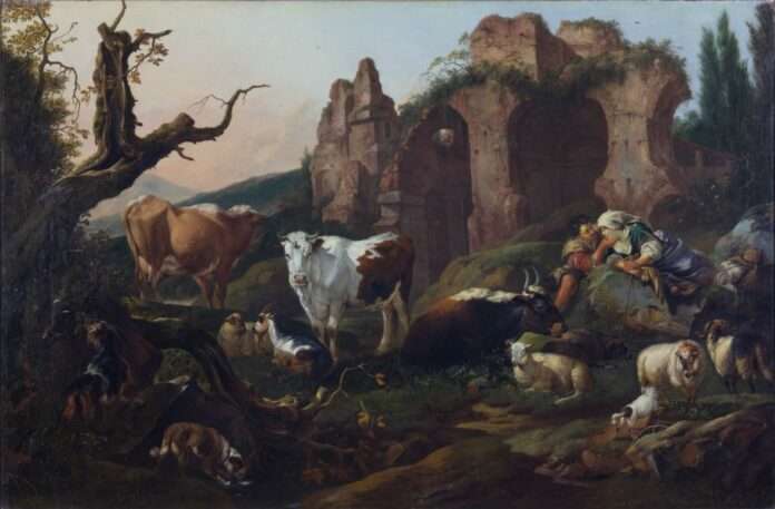 Gemälde von 1685: Johann Heinrich Roos‘ „Italienische Landschaft mit Bauern, Vieh und antiken Ruinen“