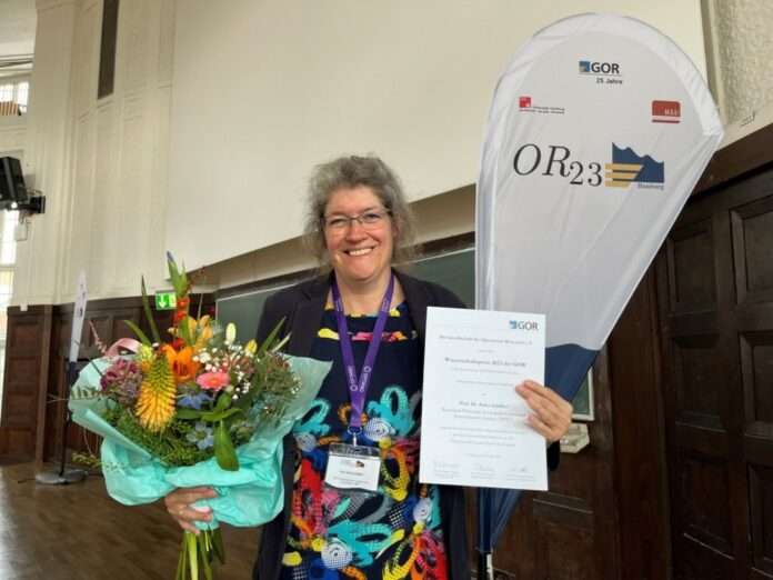 Auf der diesjährigen Jahrestagung der Gesellschaft für Operations Research (GOR) am 30. August 2023 erhielt Prof. Dr. Anita Schöbel den Wissenschaftspreis der GOR. Die Auszeichnung ist der wichtigste Preis, den die Gesellschaft vergibt und zeichnet alle zwei Jahre eine Wissenschaftlerin oder einen Wissenschaftler für außergewöhnliche Leistungen zur Entwicklung des Schwerpunktes »Operations Research« aus. Schöbel ist Leiterin des Fraunhofer-Instituts für Techno- und Wirtschaftsmathematik ITWM sowie Professorin an der Rheinland-Pfälzisch Technischen Universität Kaiserslautern-Landau RPTU.