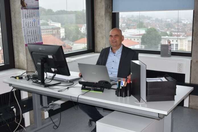 Das Foto zeigt den neuen Bürgermeister an seinem neuen Schreibtisch in Zimmer 1220 des Rathauses, wo er übergangsweise sitzen wird. Voraussichtlich Ende September wird er dann seine neuen Räume beziehen.