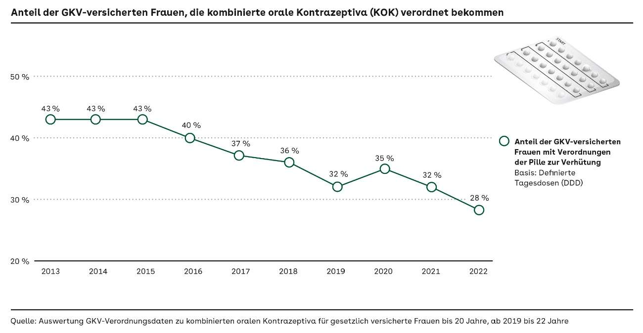 Ebenso verstetigt sich der Trend hin zu risikoärmeren Pillen. Wurden im Jahr 2013 in Rheinland-Pfalz noch fast 66 Prozent jener Präparate mit einem hö-heren Risiko für tiefe Beinvenenthrombosen und Embolien verordnet, waren es 2022 nur noch rund 49 Prozent Die Pille wird für gesetzlich versicherte Mädchen und Frauen seit dem Jahr 2019 bis zum vollendeten 22. Lebensjahr von den Krankenkassen übernommen.