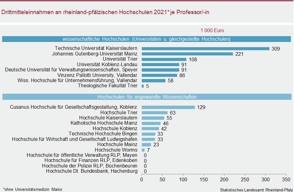 Die höchsten Drittmitteleinnahmen je Professorin bzw. Professor wurden für die Universitätsmedizin Mainz ermittelt. Die Einnahmen stiegen dort um 18,3 Prozent auf 597.000 Euro. Innerhalb der wissenschaftlichen Hochschulen folgte die Technische Universität Kaiserslautern. Hier entfielen rechnerisch 309.200 Euro auf jede Professorin bzw. jeden Professor. Im Durchschnitt kamen die rheinland-pfälzischen wissenschaftlichen Hochschulen (inkl. Unimedizin Mainz) auf 230.800 Euro je Professorin bzw. Professor (plus 11,8 Prozent).
