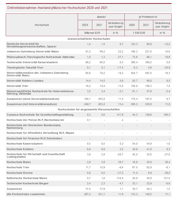 Die Johannes-Gutenberg-Universität Mainz warb mit 99,2 Millionen Euro die meisten Drittmittel unter den wissenschaftlichen Hochschulen ein; das waren 22,2 Prozent mehr als im Vorjahr. Die zweithöchsten Einnahmen verbuchte die Universitätsmedizin Mainz mit 78,2 Millionen Euro (plus 19,2 Prozent), die dritthöchsten die Technische Universität Kaiserslautern mit 66,5 Millionen Euro (plus 0,4 Prozent). Zusammen kamen alle wissenschaftlichen Hochschulen in Rheinland-Pfalz auf rund 283 Millionen Euro (plus 13,4 Prozent).