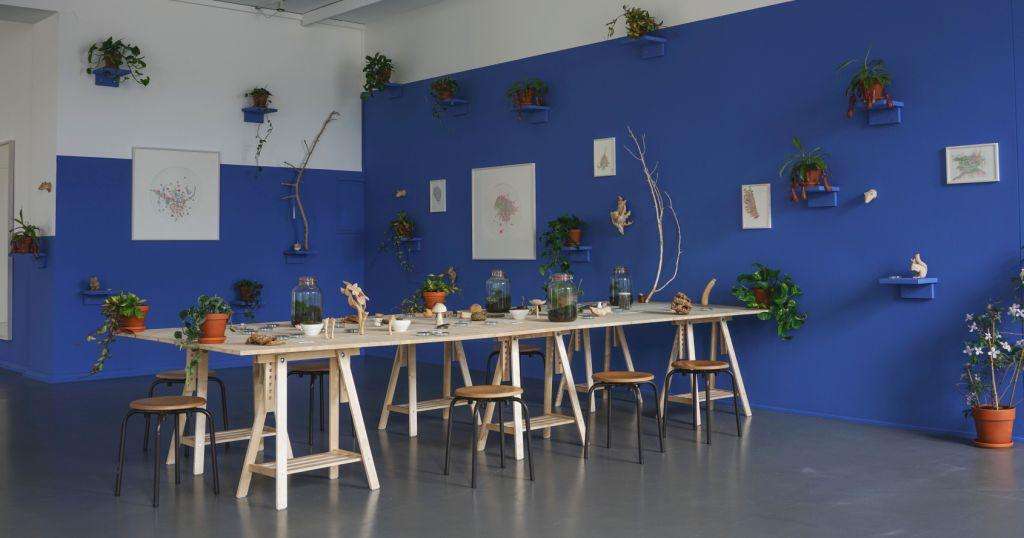 Gabriela Oberkoflers Installation „Labor“ von 2023: lebende Pflanzen, Aufzuchtstationen, Moosgläser, Zeichnungen; Holzobjekte, Lindenholz geschnitzt; diverse Objekte, Vogelnest; Pferdezahn; Hornissennest