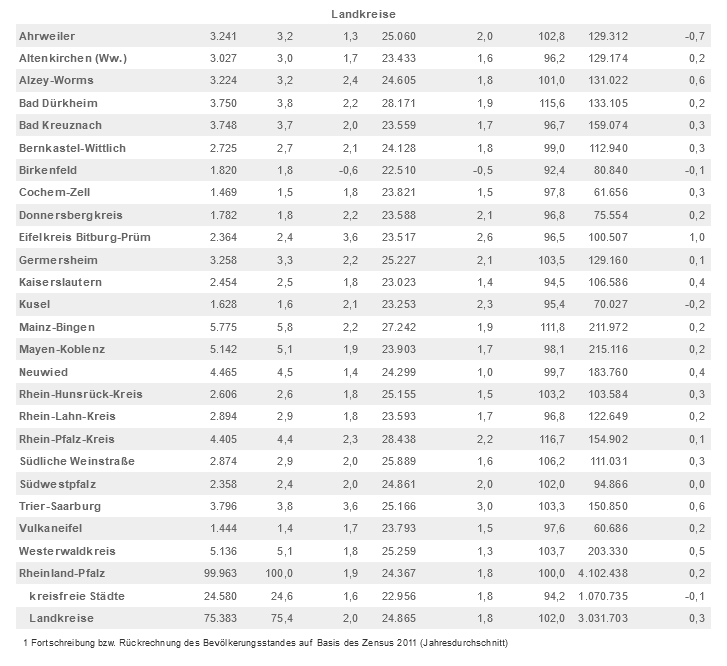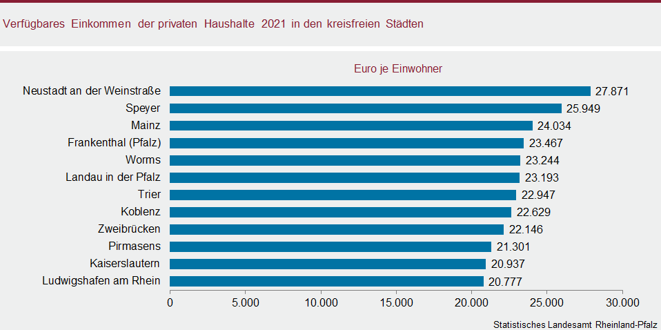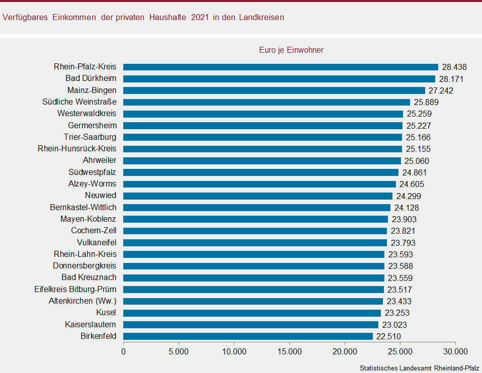 In den Landkreisen war das verfügbare Einkommen der privaten Haushalte je Einwohnerin bzw. Einwohner mit durchschnittlich 24.865 Euro höher als in den kreisfreien Städten mit 22.956 Euro. Im Vergleich der Landkreise erreichten die Einwohnerinnen und Einwohner im Rhein-Pfalz-Kreis mit 28.438 Euro das höchste Pro-Kopf-Einkommen; in Birkenfeld waren es nur 22.510 Euro. Bei den kreisfreien Städten reichte die Spannweite von 20.777 Euro in Ludwigshafen bis 27.871 Euro in Neustadt an der Weinstraße. Zu beachten ist, dass die regionale Einkommensverteilung in Rheinland-Pfalz stark durch Berufspendlerinnen und -pendler beeinflusst ist. Aus den Landkreisen pendeln viele Arbeitnehmerinnen und Arbeitnehmer zur Arbeit in die kreisfreien Städte. Die von ihnen erbrachte Wirtschaftsleistung wird an ihrem Arbeitsort in den Städten nachgewiesen, das dabei entstehende Einkommen wird dagegen an ihrem Wohnort in den Landkreisen erfasst.