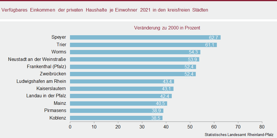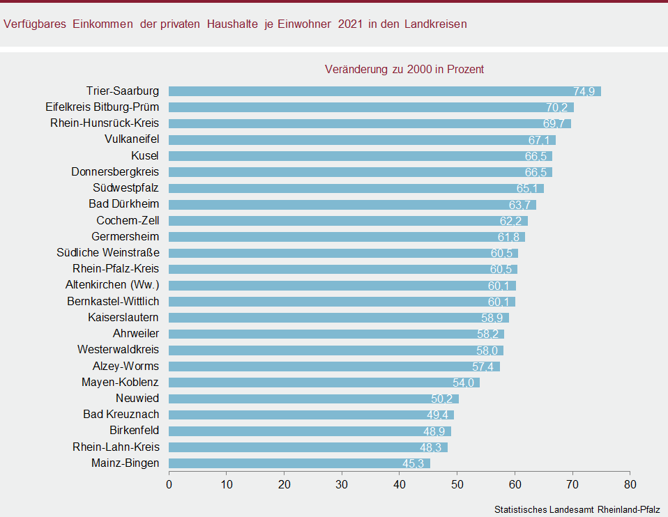 Den stärksten Anstieg des Pro-Kopf-Einkommens gegenüber dem Jahr 2000 verzeichnete unter den kreisfreien Städten Speyer mit plus 63 Prozent, dicht gefolgt von der Trier mit plus 61 Prozent. Mit deutlichem Abstand folgte die Stadt Worms mit plus 54 Prozent. Dagegen nahm das Einkommen je Einwohnerin und Einwohner in Koblenz und Pirmasens jeweils nur um 39 Prozent zu. Im Vergleich der Landkreise erzielte der Kreis Trier-Saarburg mit plus 75 Prozent den höchsten Zuwachs beim Pro-Kopf-Einkommen, gefolgt vom Eifelkreis Bitburg-Prüm und dem Rhein-Hunsrück-Kreis mit jeweils plus 70 Prozent. Bitburg-Prüm, Trier und Trier-Saarburg liegen im Einzugsbereich von Luxemburg. Da in den vergangenen 20 Jahren immer mehr Menschen aus den grenznahen Gebieten dorthin zur Arbeit auspendeln, profitiert die Region von der starken wirtschaftlichen Dynamik des Großherzogtums. Im Landkreis Mainz-Bingen sowie im Rhein-Lahn-Kreis stieg das Pro-Kopf-Einkommen dagegen nur um 45 bzw. 48 Prozent.