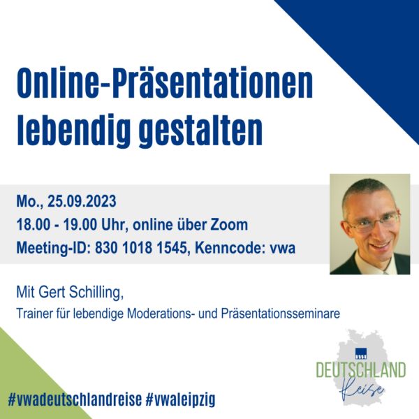 Am 25. September informiert Herr Gert Schilling, Trainer für lebendige Moderations- und Präsentationsseminare, im Rahmen der VWA-Deutschlandreise zum Thema „Online- Präsentationen lebendig gestalten“.