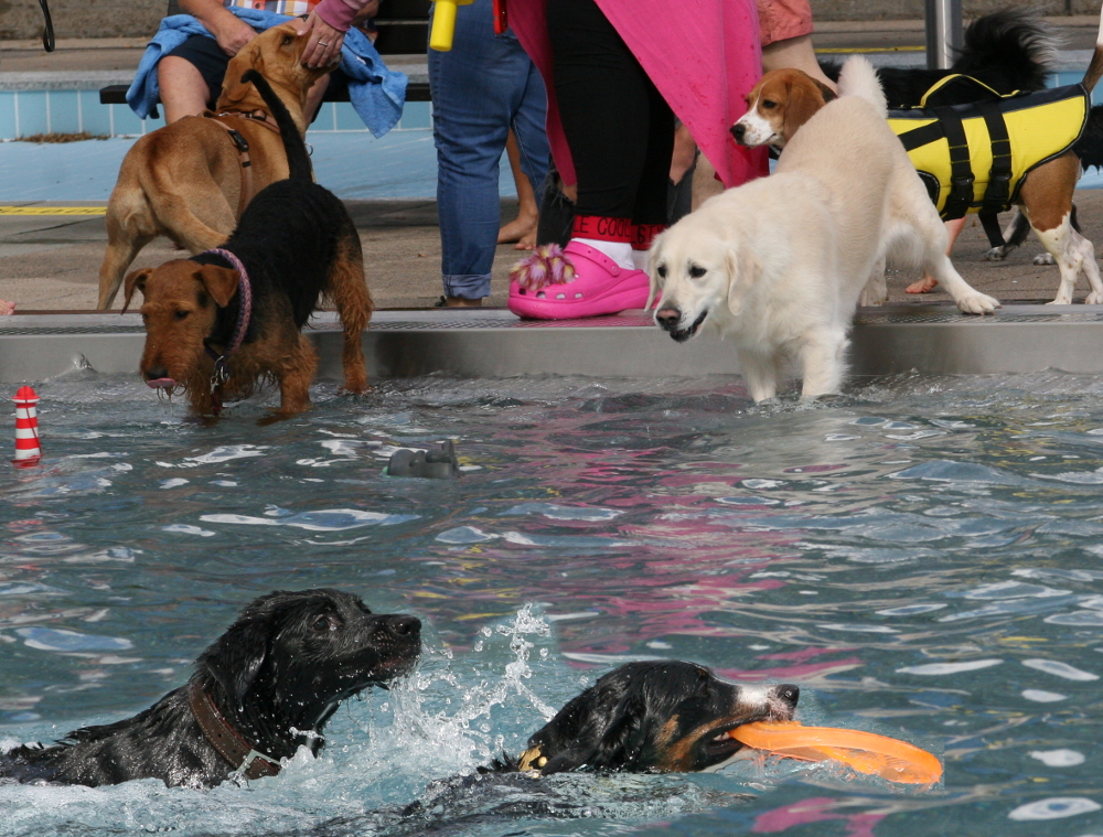 Premiere geglückt! Das erste Hundeschwimmen im Lautrer Warmfreibad am Samstag – kurz nach Ende der offiziellen Badesaison – wurde gut angenommen und sorgte für großen Spaß bei den anwesenden Vierbeinern. Insgesamt 81 Hunde mit ihren Begleiterinnen und Begleitern nutzten die Chance für ein ausgiebiges Planschen im Freibadbecken. Sportdezernentin Anja Pfeiffer und Sportreferatsleiter Ludwig Steiner ließen es sich beide nicht nehmen, persönlich dabei zu sein, als die ersten Hunde mehr oder weniger zaghaft das Becken für sich eroberten. „Wir haben hier ein schönes neues Angebot geschaffen, das nun auch richtig gut angenommen wird. Das freut mich sehr!“, so Beigeordnete Pfeiffer. „Wie wollten mit der Erstausgabe einfach mal Erfahrungen sammeln, ob und wie das funktionieren kann. Ich kann mir aber sehr gut vorstellen, dass hier heute der Anfang einer jährlichen Tradition gemacht wurde.“