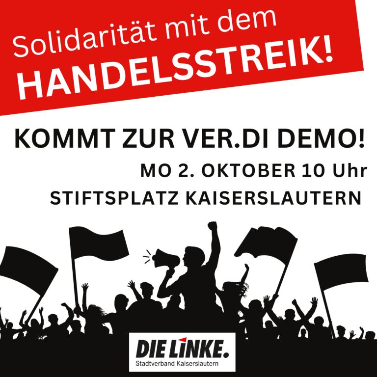 Wir rufen die Kaiserslauterer Stadtgesellschaft auf zur Demonstation der streikenden Handelsmitarbeiter*innen zu gehen um diese in ihrem Kampf zu unterstützen: