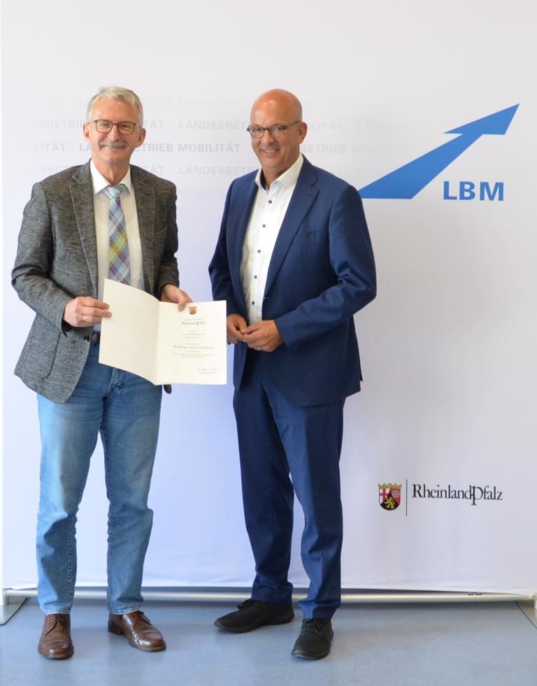 LBM-Geschäftsführer Franz-Josef Theis hat ihm jetzt die Dankesurkunde von Ministerpräsidentin Malu Dreyer überreicht. „Herzlichen Dank für Ihre Treue. Sie sind mit Herz und Seele Bauingenieur und ein heimatverbundener Wahlpfälzer. So verwundert es nicht, dass Sie unermüdlich daran arbeiten, die Infrastruktur in der Westpfalz voranzubringen.“