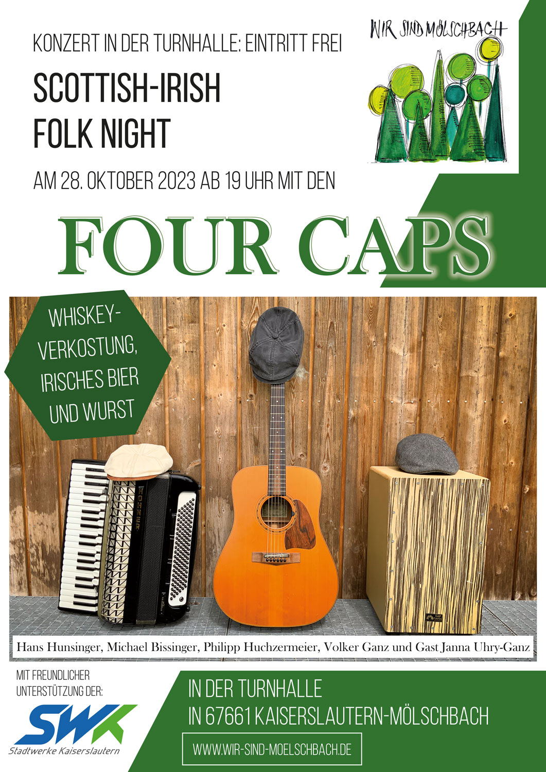 Am Samstag, den 28. Oktober, findet ab 19:30 Uhr die Irish-Scottish Folk Night in Kaiserslautern-Mölschbach statt. Die Mölschbacher Band FOUR CAPS (Hans Hunsinger, Michael Bissinger, Philipp Huchzermeier, Volker Ganz) und Sängerin Janna Uhry-Ganz treten in der Turnhalle Mölschbach auf. Die FOUR CAPS spielen traditionelle Folkmusikinstrumente wie die Tin Whistle und das Akkordeon. Im Ausschank wird es u.a. irisches Bier und eine eine Whiskeyverkostung mit „We Call It Whisky“ geben. Der musikalische Abend findet mit freundlicher Unterstützung der SWK statt.