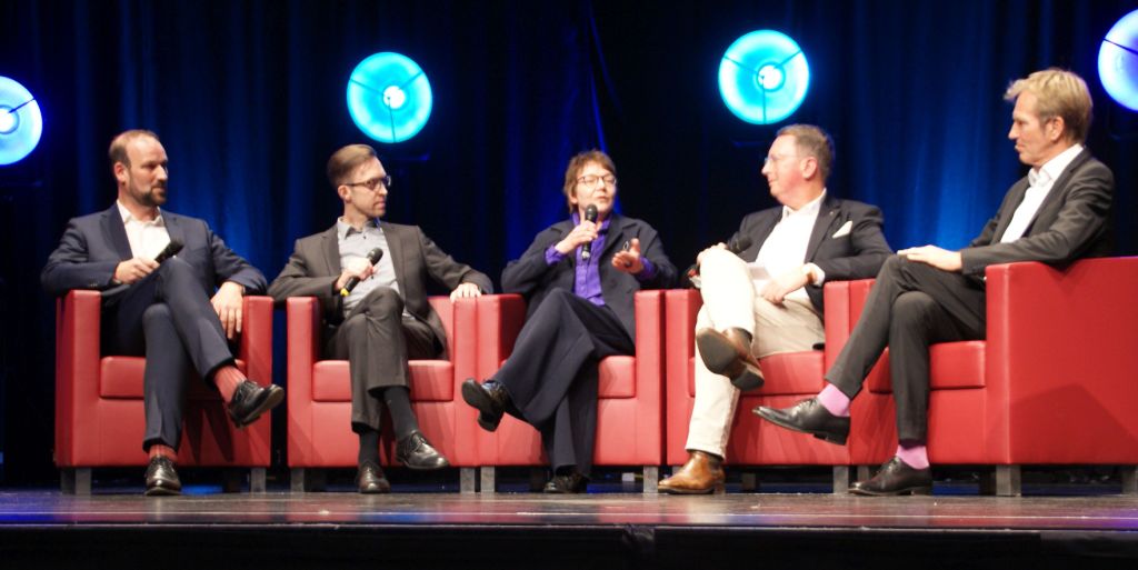 Lebhafte Diskussion (von links): mpk-Direktor Steffen Egle, Kurator Dr. Sören Fischer, Kuratorin Dr. Annette Reich, Dr. Christoph Dammann, Direktor des Kulturreferats der Stadt Kaiserslautern, und Moderator Markus Brock