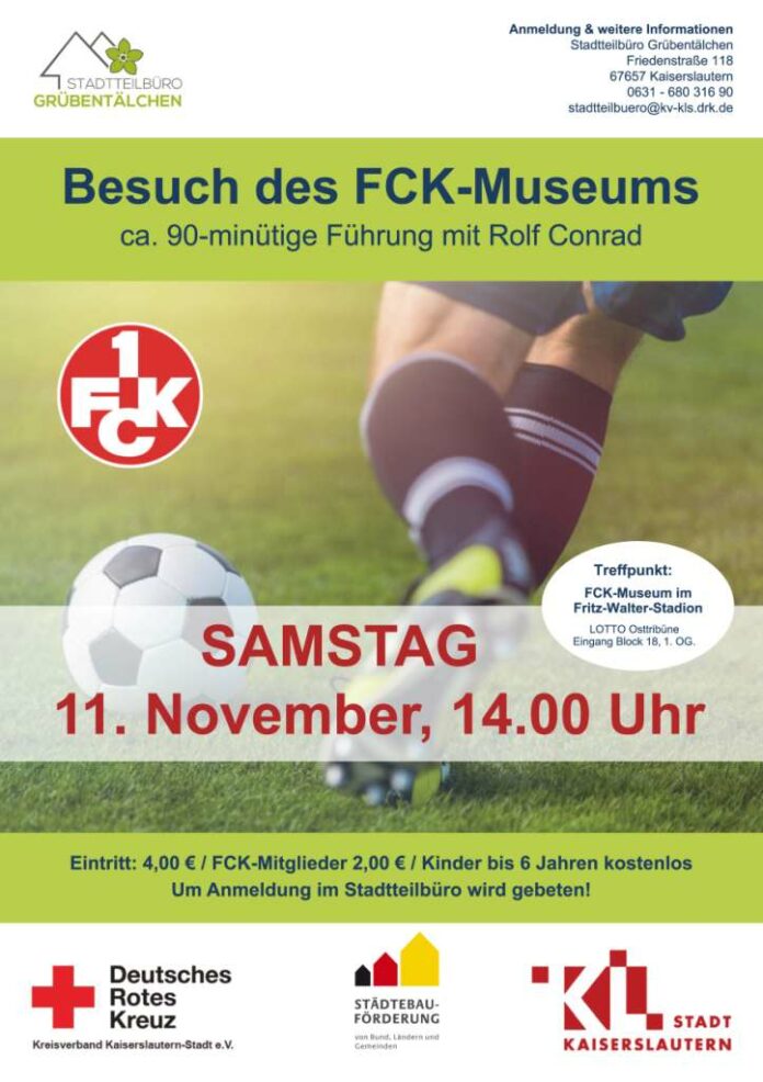 Das Stadtteilbüro Grübentälchen lädt ein zum Besuch des FCK-Museums am Samstag, den 11. November, um 14:00 Uhr. Rolf Conrad, ehrenamtlicher Mitarbeiter des FCK-Museums und Mitglied des 1. FCK Fanclubs Fairplay, führt Sie ca. 90 Minuten durch die Räumlichkeiten und erzählt Geschichten und Anekdoten rund um die Exponate.