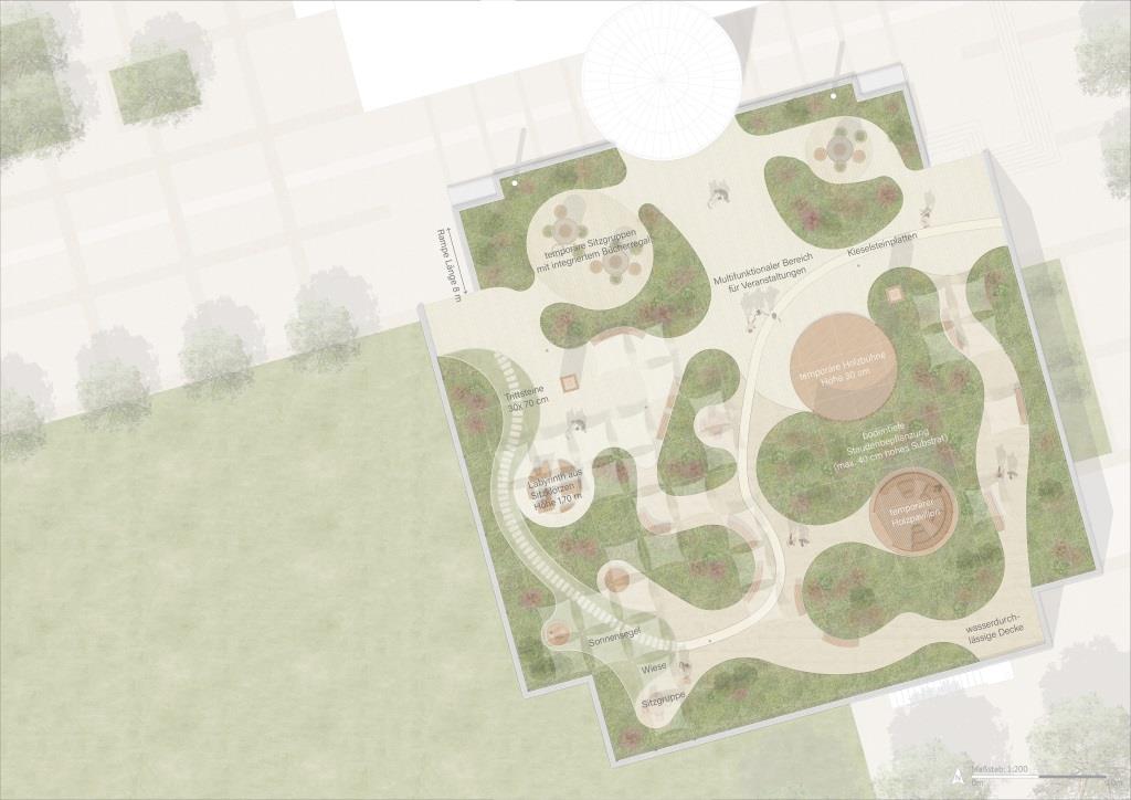 Ideen für die Umgestaltung der Fläche einbringen. Auf dieser Grundlage haben die Master-Studierenden der Raum- und Umweltplanung, Nadja Hofmann, Luca Preiß und Jan Pohl, drei Entwürfe für die Fläche entwickelt. Knapp zehn Wochen standen die Entwürfe auf