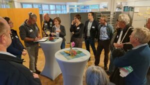 Anschließend stellten die Biosphären-Teams beim lockeren und informativen Beisammensein verschiedene deutsch-französische Projekte und Arbeitsfelder genauer vor. Die Gäste nutzen die Gelegenheit, mit den Mitarbeiterinnen und Mitarbeitern der Geschäftsstellen in La Petite-Pierre und Lambrecht in Austausch zu kommen und Fragen rund um typische Tätigkeitsfelder wie Naturschutz, Biodiversität, Regionalentwicklung, regionale Produkte, Kulturlandschaftspflege, Bildung für nachhaltige Entwicklung und Kommunikation zu vertiefen.