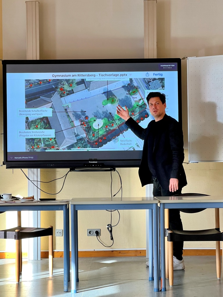 Wie fast jeder Schulhof so ist auch der am Gymnasium am Rittersberg von viel betonierter Fläche geprägt. In Zeiten des Klimawandels kein guter Zustand. Deswegen engagieren sich zahlreiche Schülerinnen und Schüler im Projekt RB Green mit dem Ziel, den Schulhof grüner werden zu lassen. Gute Nachrichten gab es dafür vom Beigeordneten und Umweltdezernent Manuel Steinbrenner. „Wir wollen rund 260.000 Euro aus dem Förderprogramm zum Kommunalen Klimaschutz für dieses Vorzeige-Projekt in Sachen Klimaanpassung nutzen.“ Die Pläne zur klimafreundlichen Umgestaltung des Schulhofes, die vom Referat Grünflächen der Stadt erstellt wurden, hatte Steinbrenner gleich im Gepäck und stellte sie den Schülerinnen und Schülern, sowie der Schulleitung und Projektleiterinnen Susanne Scheffler-Hausbrandt und Dorothee Hassel vor.